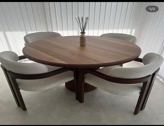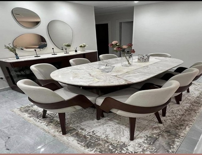 نخرج شوية من غرف النوم ونروح على السفرة والطاولات. الأكل له طعم تاني لما يكون على سفرة معمولة بذوق. تفصيل سفرة طعام خميس مشيط بيدي إحساس بالفخامة واللمة الحلوة. سواء سفرة كبيرة للعيلة أو سفرة صغيرة عملية، التصميم بيتظبط حسب المساحة والاستخدام.